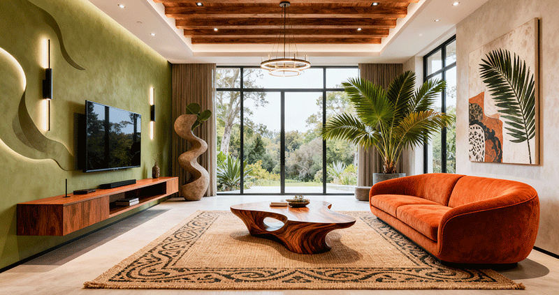 6. Ý tưởng phòng khách Đỏ gạch – Xanh ngọc lục bảo: Trầm ấm và nghệ sĩ
