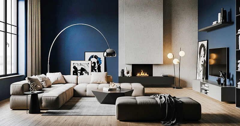 Tường nhà: Gam màu đậm như xanh navy, xám khói hay xi măng thô tạo phông nền mạnh mẽ.