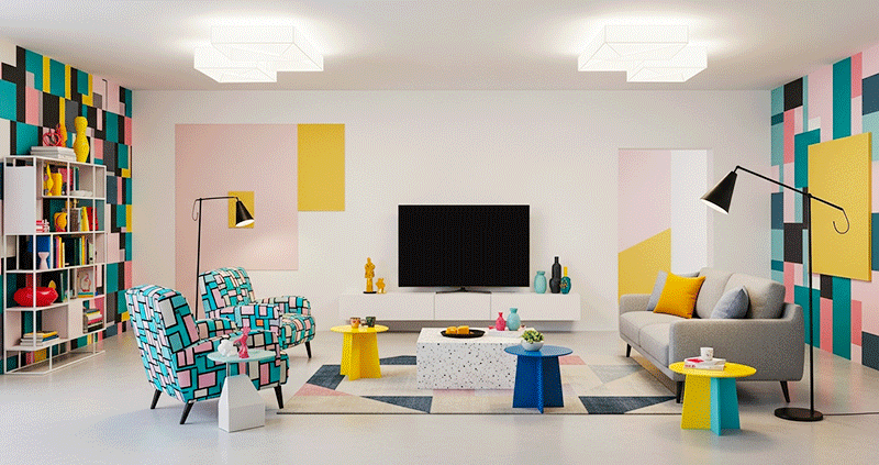 Phong cách Memphis nổi tiếng với những gam màu tương phản mạnh mẽ. Ý tưởng này phù hợp cho những ai muốn biến phòng khách thành một “bức tranh sống động”.