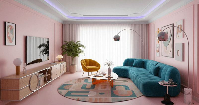 Trong phòng khách funky, đường cong và hình khối lạ chính là ngôn ngữ thiết kế. Thay vì những món đồ vuông vức, hãy thử sofa bo tròn, bàn trà dạng giọt nước, hoặc kệ tivi lượn sóng.