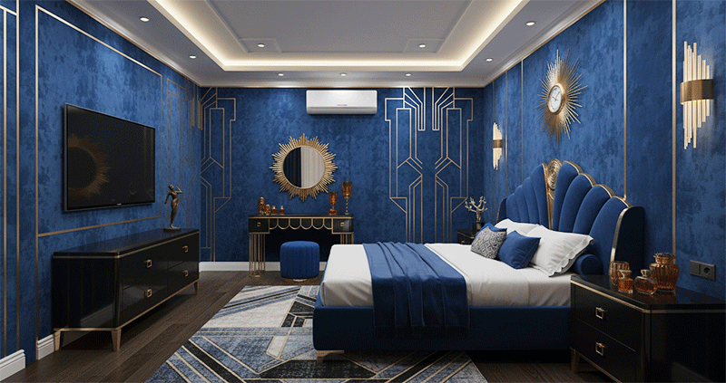 Ý tưởng thiết kế phòng ngủ màu xanh dương phong cách Art Deco