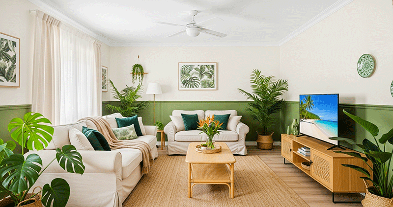 Ý tưởng thiết kế phòng khách Tropical với họa tiết lá cây sống động