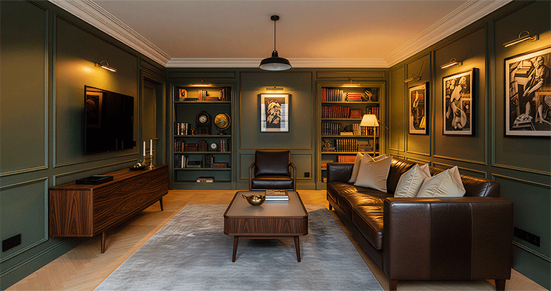 Tường: Chọn màu chủ đạo đậm (xanh rêu, burgundy, xám than). Có thể sơn nhấn hoặc ốp gỗ để tăng chiều sâu.