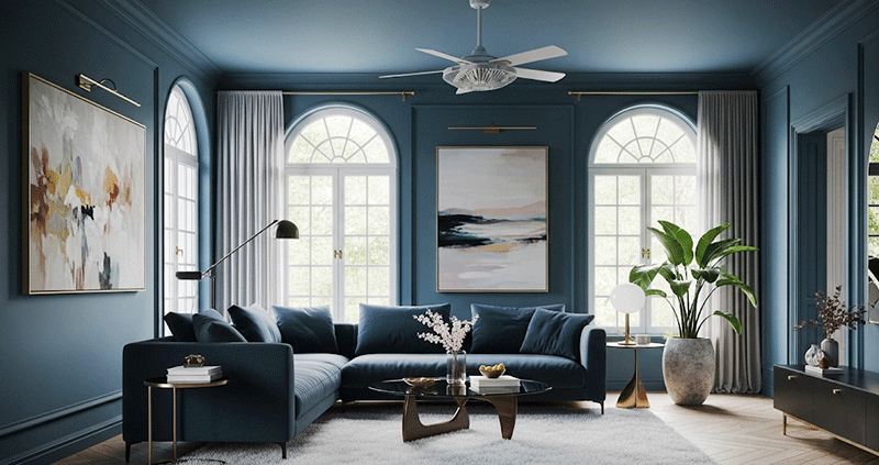 Phòng khách màu xanh dương cùng ánh sáng tự nhiên và nhân tạo