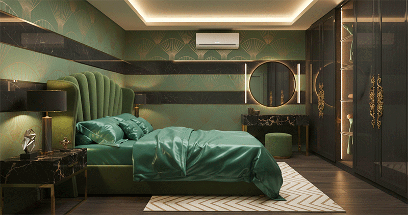 7. Phòng ngủ xanh rêu kết hợp ánh kim – Vẻ đẹp quyền quý đầy mê hoặc