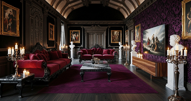 Trong thiết kế phòng khách Gothic, màu sắc giữ vai trò quyết định thần thái, thường dùng gam trầm tối như đen, tím than, đỏ đô, xanh rêu, điểm nhấn bằng vàng đồng hoặc bạc cổ.
