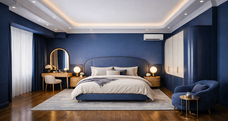 Ý tưởng thiết kế phòng ngủ xanh navy với nội thất đường cong