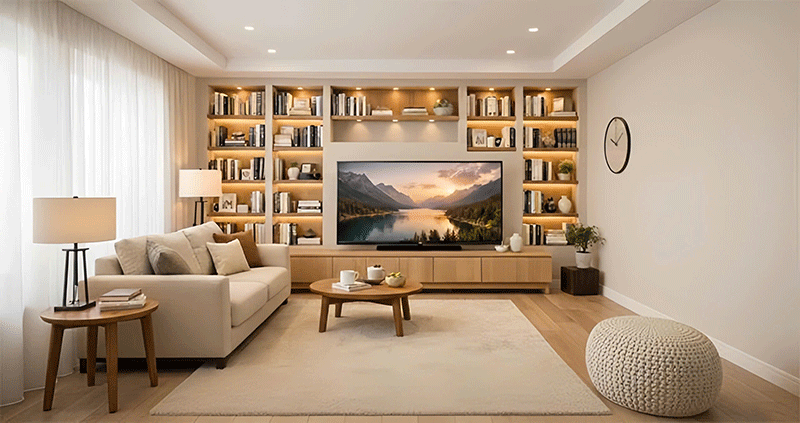 Mô tả ý tưởng: Ánh sáng được tích hợp vào kệ âm tường, nhấn cấu trúc, tạo chiều sâu và cảm giác sang trọng cho phòng khách.